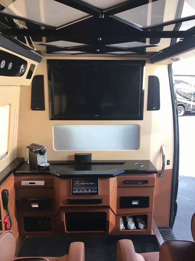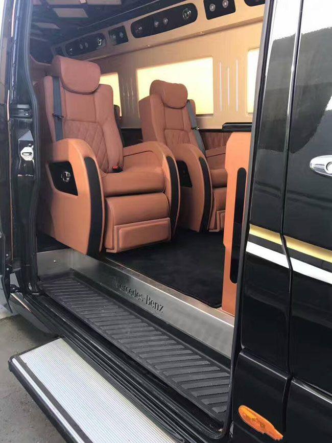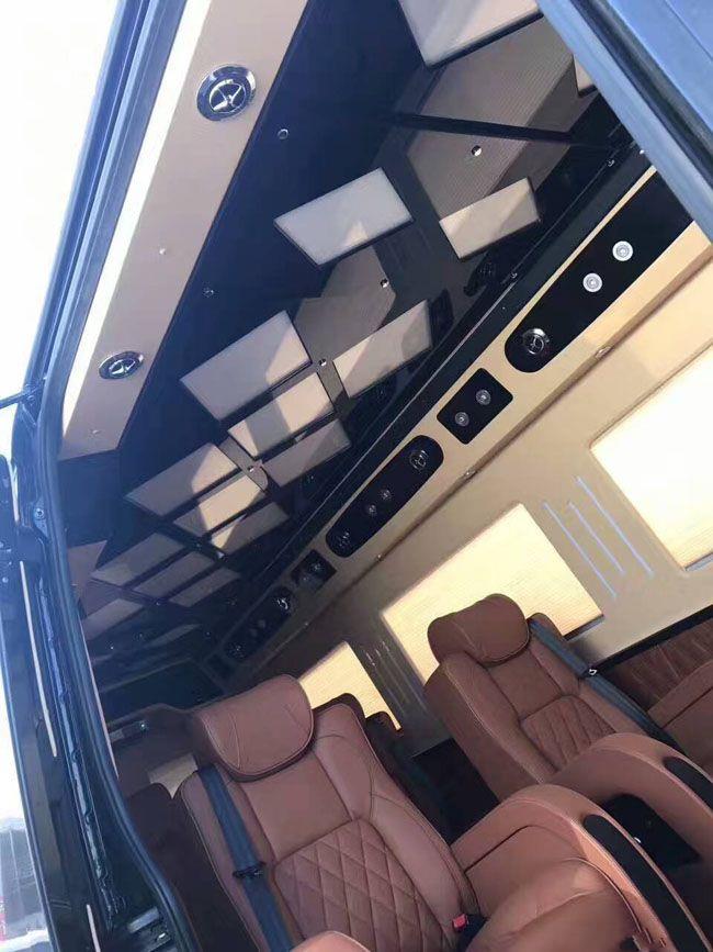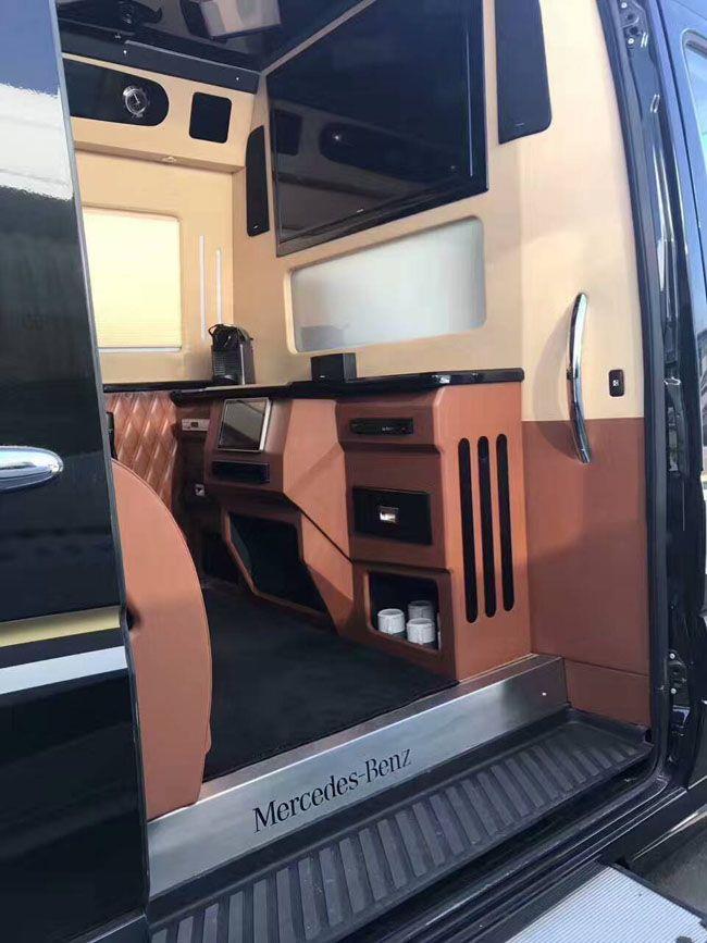 進口奔馳斯賓特車內大面積真皮包裹,前后排座椅均可向后大角度放倒,方面躺著休息,前后排均有觸控屏幕,電動窗簾、全自動隱藏吧臺、可升降高清液晶顯示器、boss音響等等通過控制屏均可操作,另外還配備了可拆卸的辦公桌??赊k公,可娛樂,可拆卸——節約空間的同時也提高了乘客艙的高逼格。